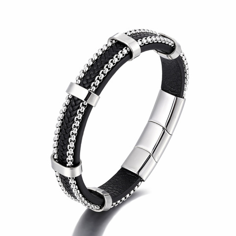 マルチレイヤーパンクHiphop 316Lステンレススチールメンズシルバーカラー編組レザーレザーレザーブレスレットバングル男性用