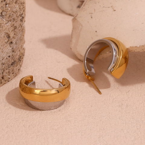 女性用18K金メッキシルバー製ツートーンステンレススチール二重層ヒンジ付きフープC型ループ個性派スタッドピアス