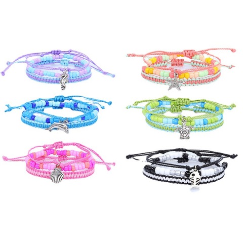 3PCS/세트 수제 3 층 왁스 끈 보헤미아 꼰 바다 바다 바다 동물 불가사리 씨앗 페르시 메모리 와이어 보석 팔찌