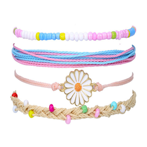 4PCS/세트 보헤미아 수제 짠 4 레이어 다층 왁스 끈 꼰 페르시 데이지 꽃 매력 보석 팔찌